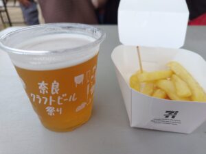 さぁ、これが最後です。これも行ったことがない、下市町の「KITO FORESTMARKET SHIMOICHI」さんの「クラシックアメリカンIPA」。最後にシンプルな、ガツンと来る苦みが美味しいビールを堪能しました。ちなみにおつまみは奈良県庁内にあるセブンイレブンで唐揚げとポテトを購入。会場のテナントはビールを呑むのに使うコインで買う為、そんな無駄遣いはしないのだ。主役はビールだからね。