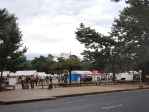 生憎の雨だったが駅から歩き、県庁の向かい、何やらテントが沢山ある奈良公園の一角に到着。