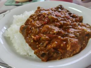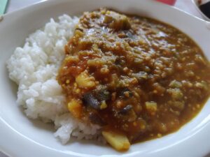 最初に肉を炒める際にマキシマムを振って、更に料理酒もちょっと加えます。そんで茄子とピーマンとトマト缶を全投入、10分中火で煮込んで蓋を開けて一旦かき混ぜてまた15分程煮込んだら火を止めて、4分割した内の3ブロックのカレールー、カレー粉大匙2杯、ソース少々で味付けして混ぜて溶かしながら最後にもっかい弱火で整えて完成、って感じ。