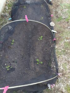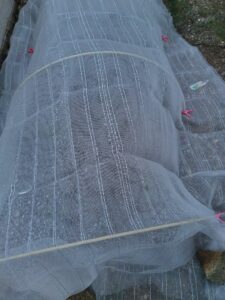 その2日後、ナフコで買った防虫ネットに張り替えを決行。・・・1.8m×5mって割と大きなサイズですね?一応二段の畝を覆う為に貼りましたが、横は十分過ぎたし、縦なんて2つ折りにしてちょうど良い長さでした。これなら真ん中で切って畝二段を2つ、四段に使えるかもしれない。