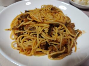完成したのと、パスタに絡めたのがこちら。味はしっかりとミートソースだし、具材も野菜沢山で食べ応えのあるパスタになりました。