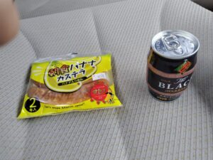 まぁまずは朝御飯。前日に黒滝村の道の駅で朝食バナナを買っておいたので、これを自販機のあったか~いのコーヒーで。