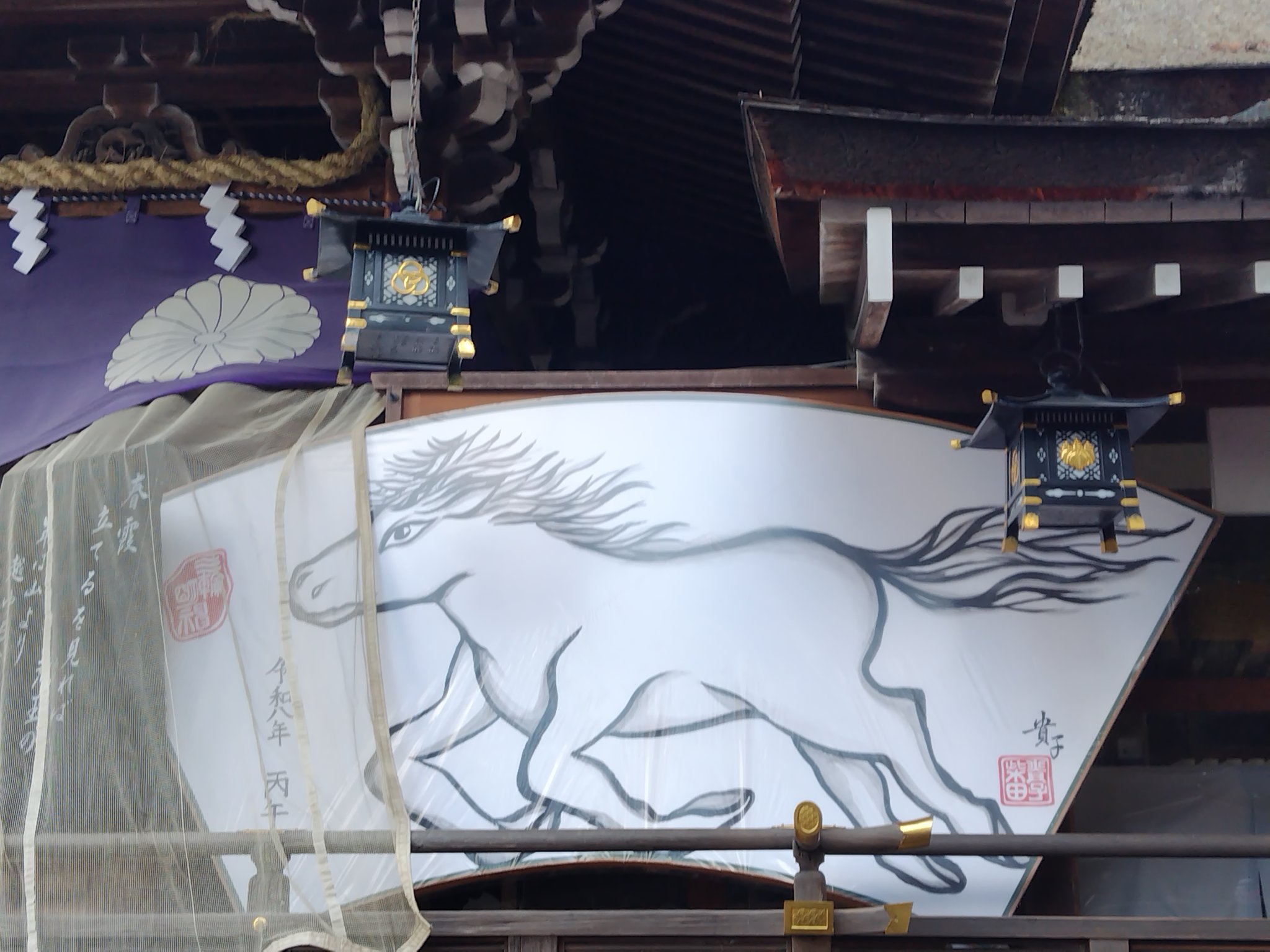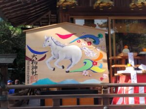 御垣内の入り口は本堂の左側に。ご丁寧な案内と、今年の干支である午の大きな絵馬が鎮座していました。