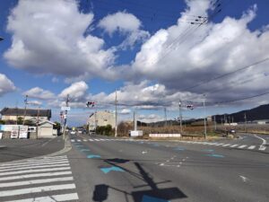 降りたら踏切を渡って、案内の通りに歩いて行けば着きます。そもそもこの辺りからも神社のある森林が見えていますので、迷うことはないでしょう。