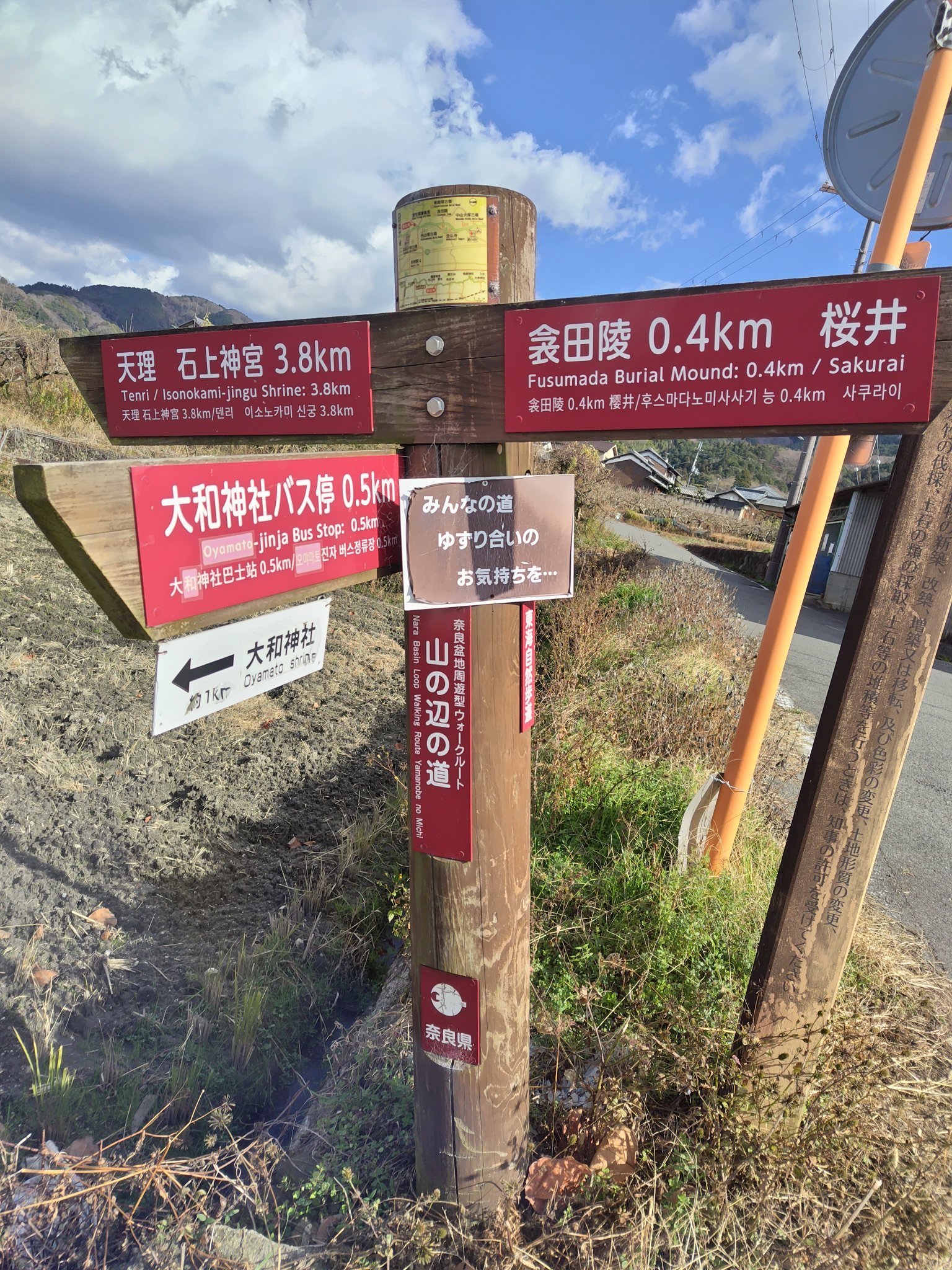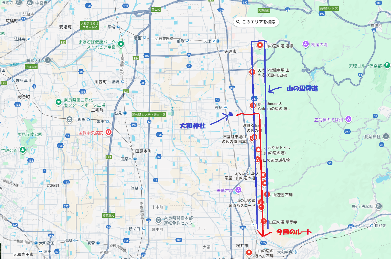 さて、大和神社の参拝も終わったし、次は電車で大神神社や橿原神宮へ行こうかな、というのが当初の予定でしたが、同行していた父から「山の辺の道」を歩いて大神神社まで行くことを提案されたので、こんな機会でも無いと歩くことすらないと思ったのでそうすることにしました。