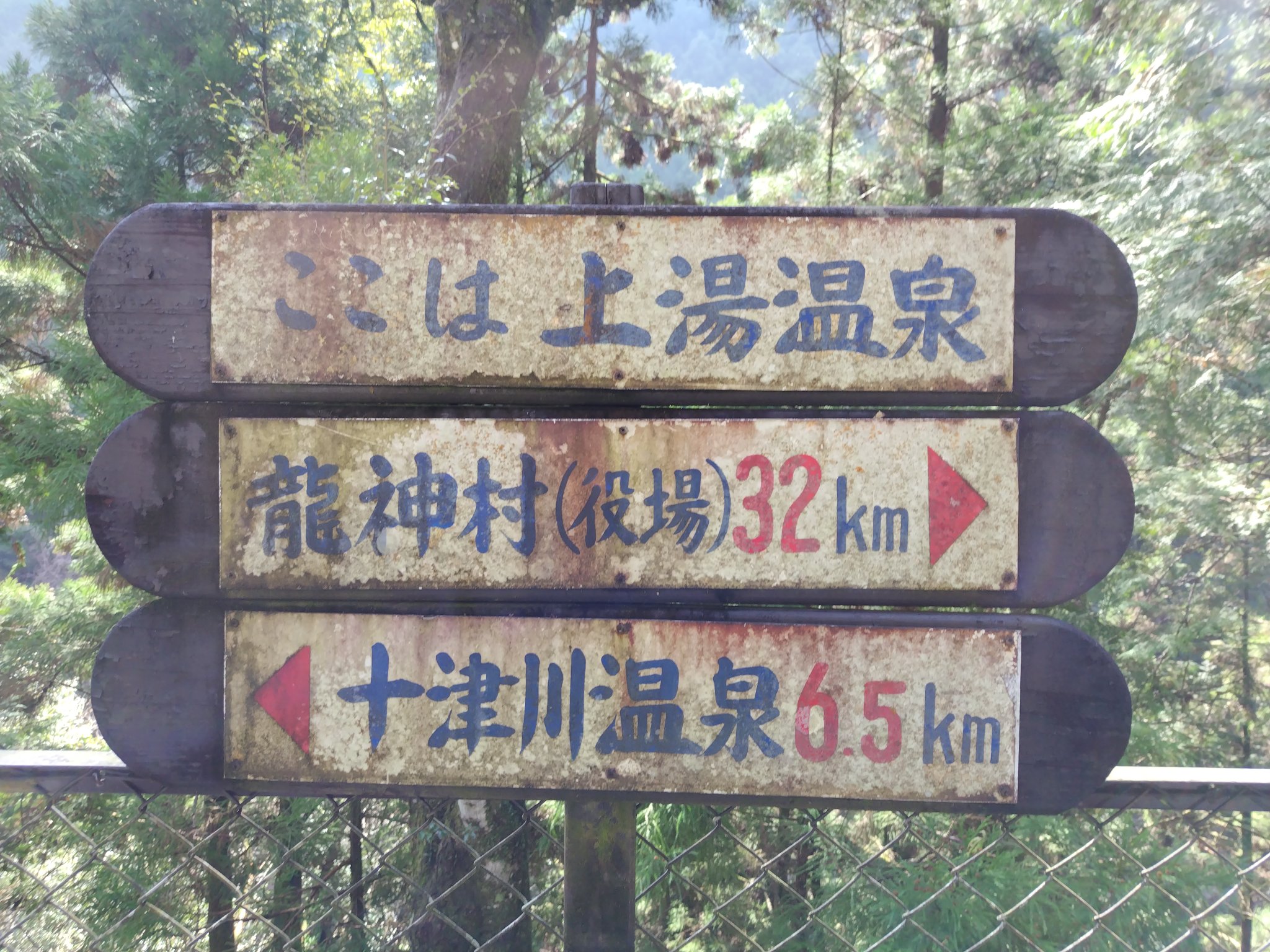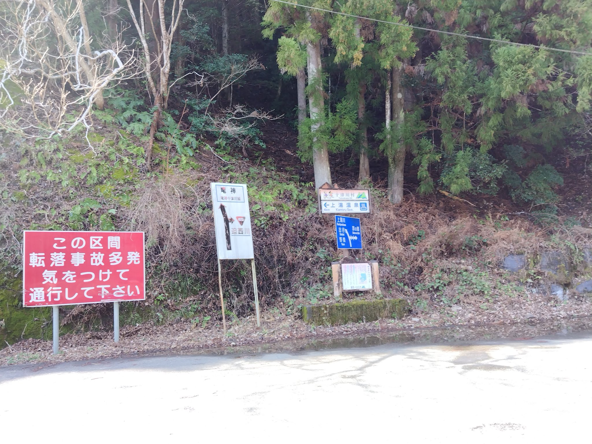 来た道をそのまま戻れば帰れますが、この交差点で左へ曲がって寄り道。そのまま425号線を真っ直ぐ進んで、トンネルを超えれば最悪の酷道を進めますが、そのトンネルの前で左へ分岐する735号線を走って、およそ10分すると「上湯温泉」に到着。