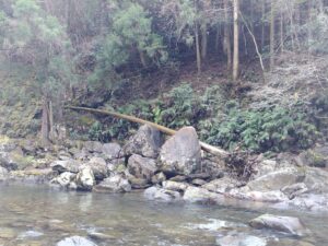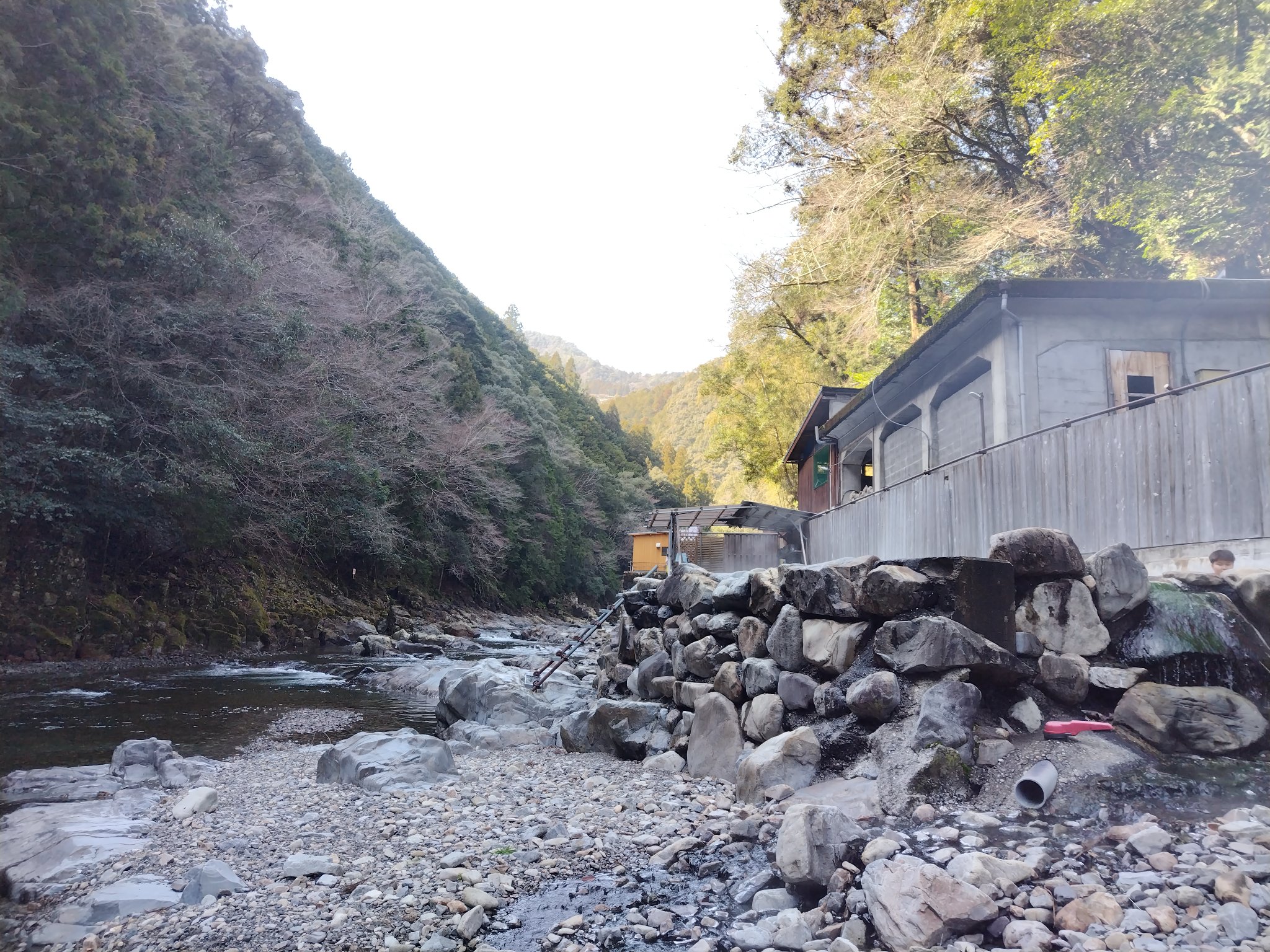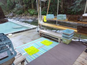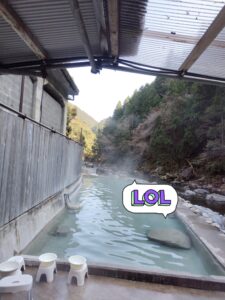 なんと、そこにあったのは露天風呂が一つ!本当に上湯川の隣にあるから上湯温泉。しかもこの立地で十津川温泉郷のヌルツルな源泉掛け流し、湯の花も舞う天然温泉です。ご丁寧に階段もあるから、いつでも上湯川という名の天然の水風呂に入れちゃうと来ました。