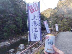 出て着替えた後も、川原でしばらくボーっとしていた位、この場所が気に入りました。帰りたくねぇ―、ずっとここにいてぇーと思いましたが、いつまでもそうするわけにもいきません。風呂上がりのノンアルコールをキメてから出発しました。ありがとう上湯温泉さん、また来ます。