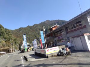 そして上湯温泉を出ておよそ30分、道の駅十津川郷=湯泉地温泉まで帰って来ました。十津川温泉郷から湯泉地温泉までが大体20分くらいの距離ですかね。とりあえず、昼飯に悩んだので串こんにゃくを1本食べておく。熱々でうまうま。