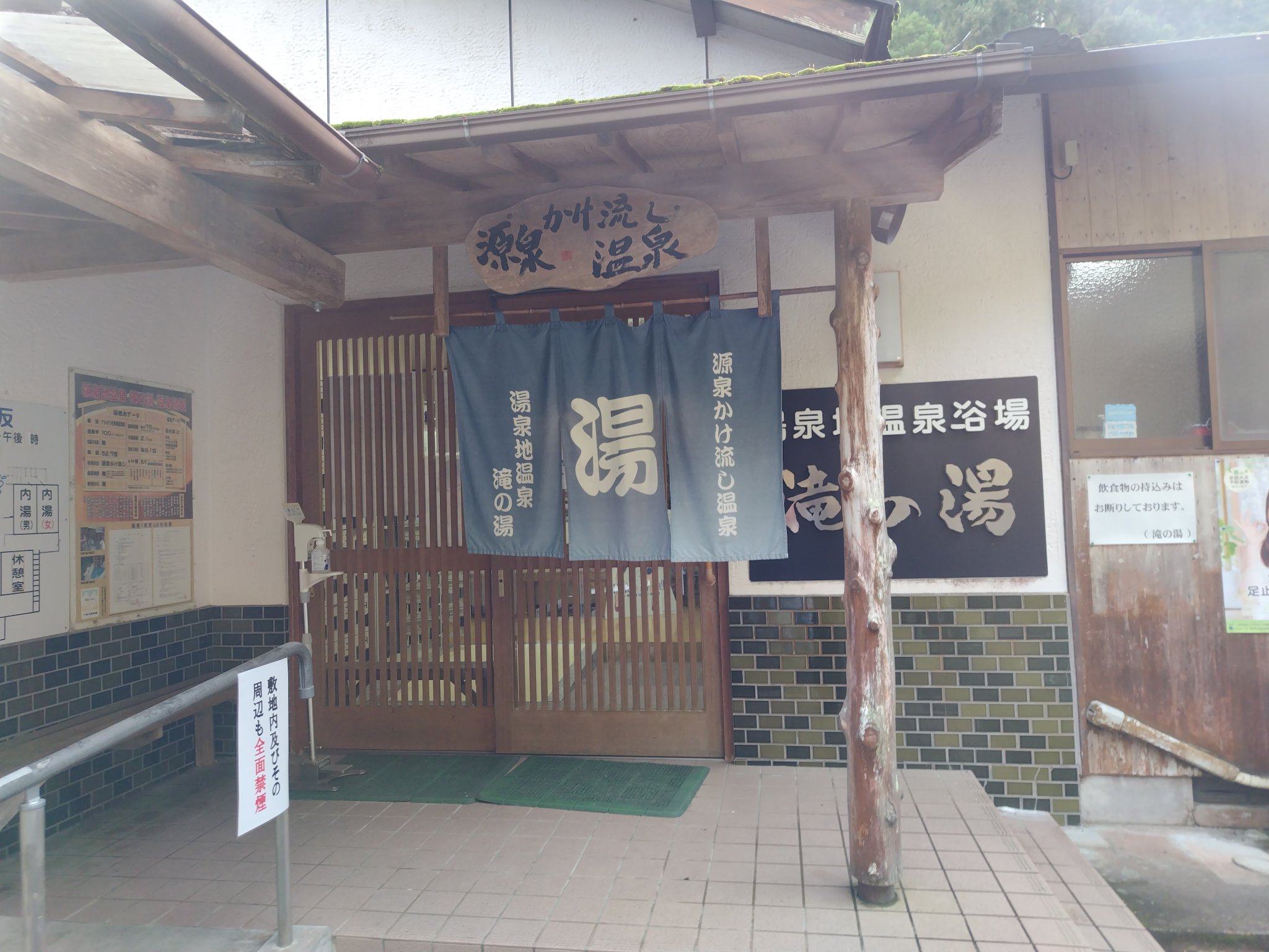 この温泉も立地がかなり特徴的。受付や屋内浴場は建物の2階に位置しまして、屋内浴場の奥に階段があります。その階段から外に出て、外の会談も降りていくと、名前の通りに滝の目の前にある露天風呂に辿り着きます。