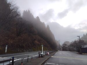 3日目の朝。前日にそりゃあもう降ったことで、朝から霧に包まれた山の中で目が覚めた。