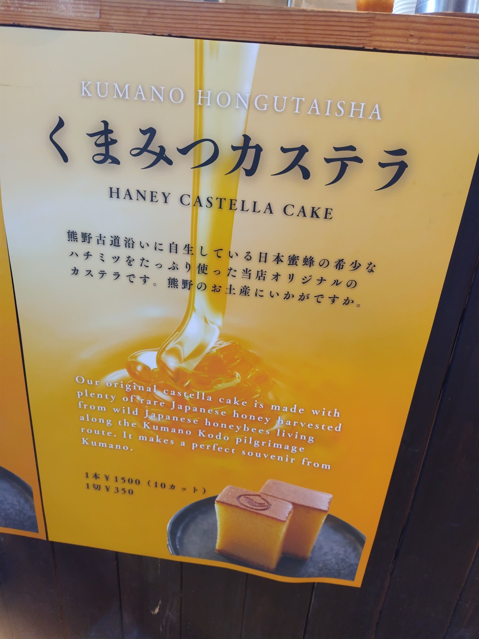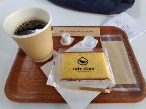 参拝の後は、本宮の入り口の鳥居の横にある喫茶店で、自家製コーヒーと熊野古道のブランド蜂蜜を使った「くまみつカステラ」で小休止。甘いのと苦いので永久ループです。