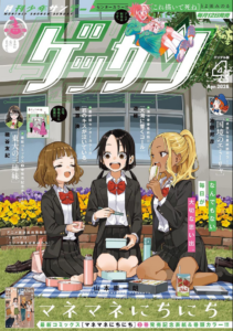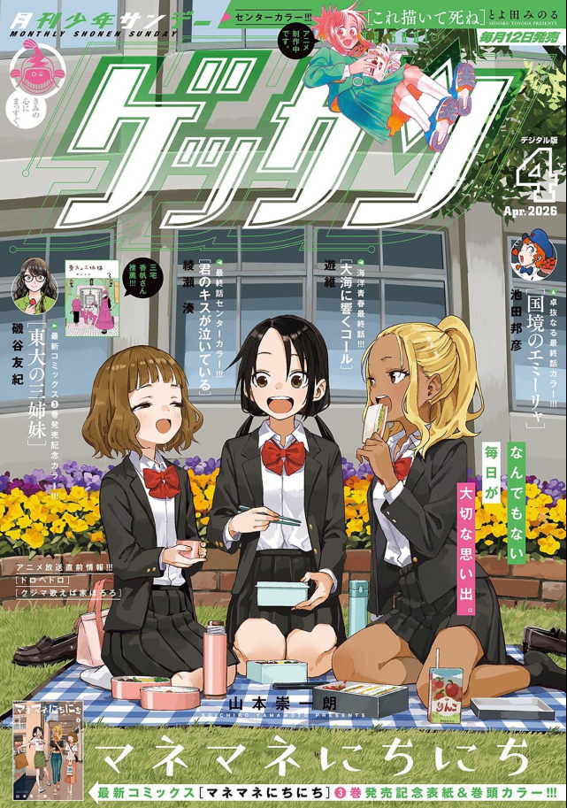 今月のゲッサンは3巻が発売ということで、マネマネにちにちが表紙&巻頭カラー。作中は夏休みですが、現実の暦に合わせた制服姿の3人が目印。
